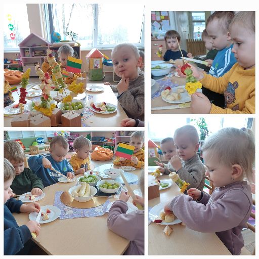 Vaikai svarstė, kaip galima „skaniai“ paminėti Lietuvos gimtadienį. Nutarė, kad ,,reikia ieškoti spalvų kaip Lietuvos vėliava. Tada visi žinos, kad Lietuvos gimtadieniui vaišės. Gamino trispalvius desertus, tortą, žele, kepė spurgytes, siūlė sveikuoliškus užkandžius.